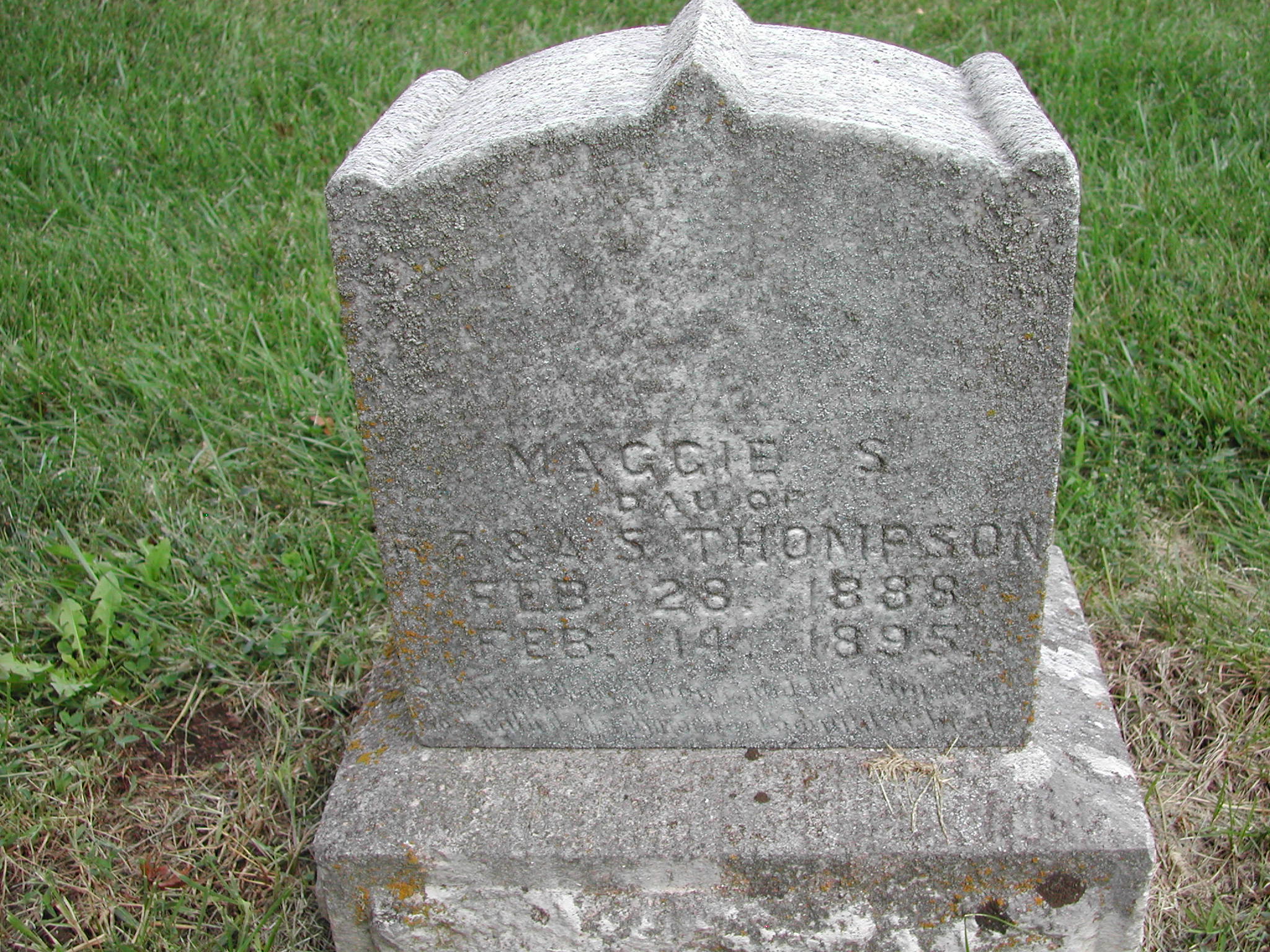 Thompson, Maggie S; b. 28 Feb 1888; d. 14 Feb 1895; Dau of F R and A S Thompson; - Veteran status N/A; Section 1; Row 02; Photo