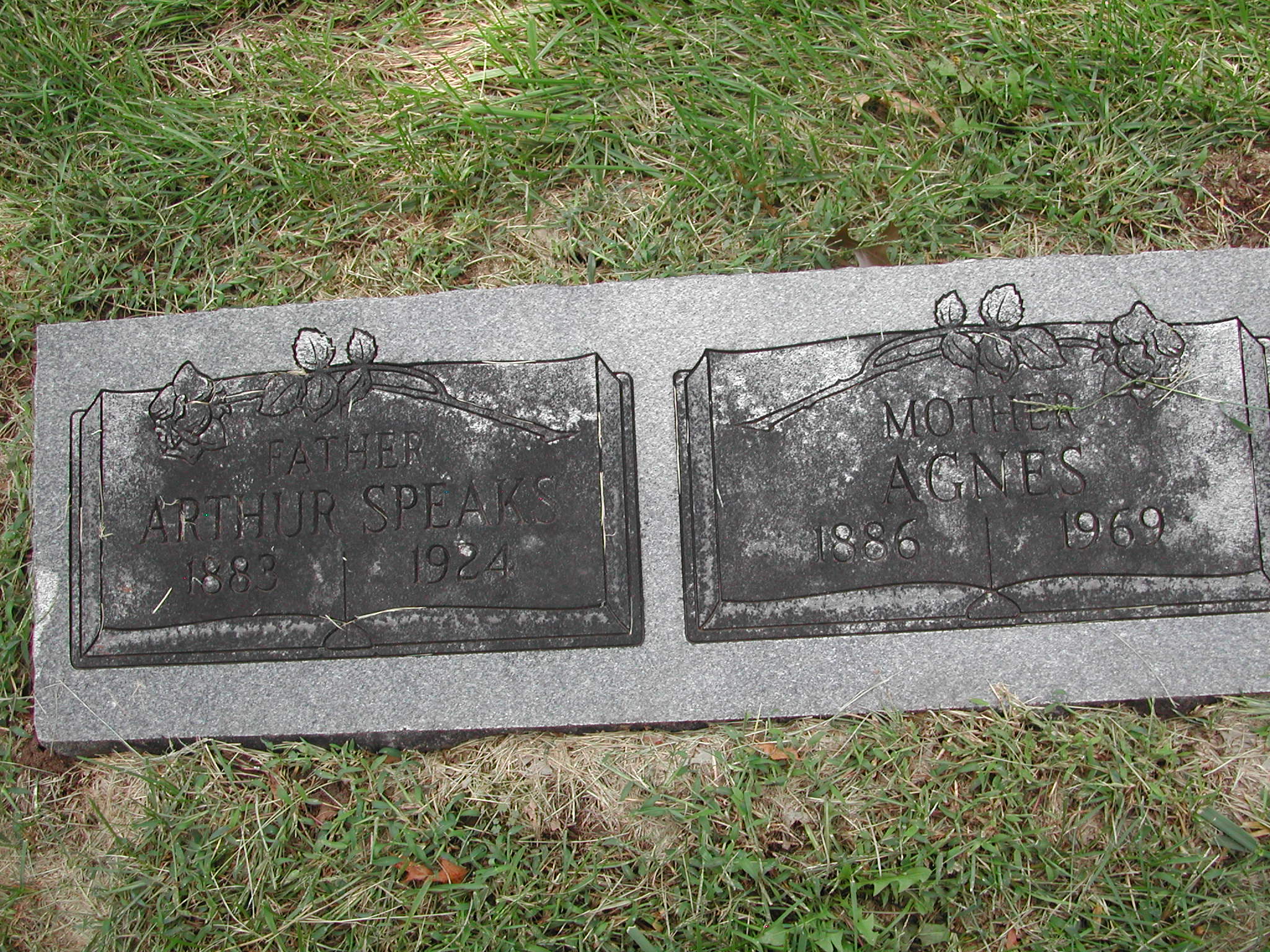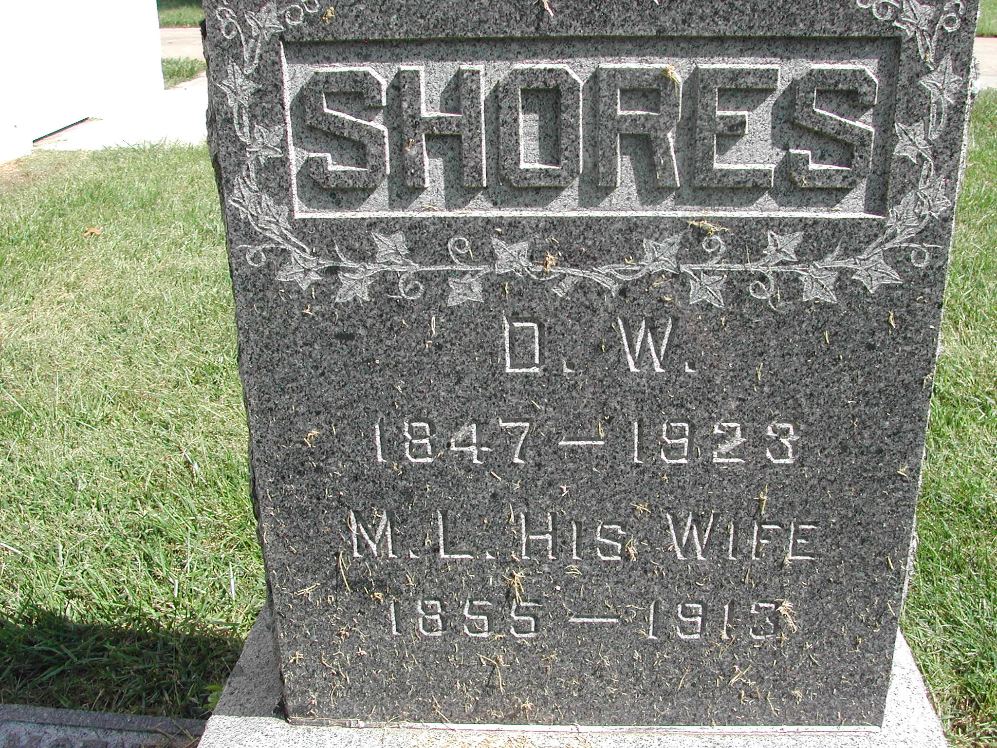 Shores, D W; b. 1847; d. 1923; Footstone Father; s/w M L Shores; - Veteran status N/A; Section 1; Row 06; Photo Photo