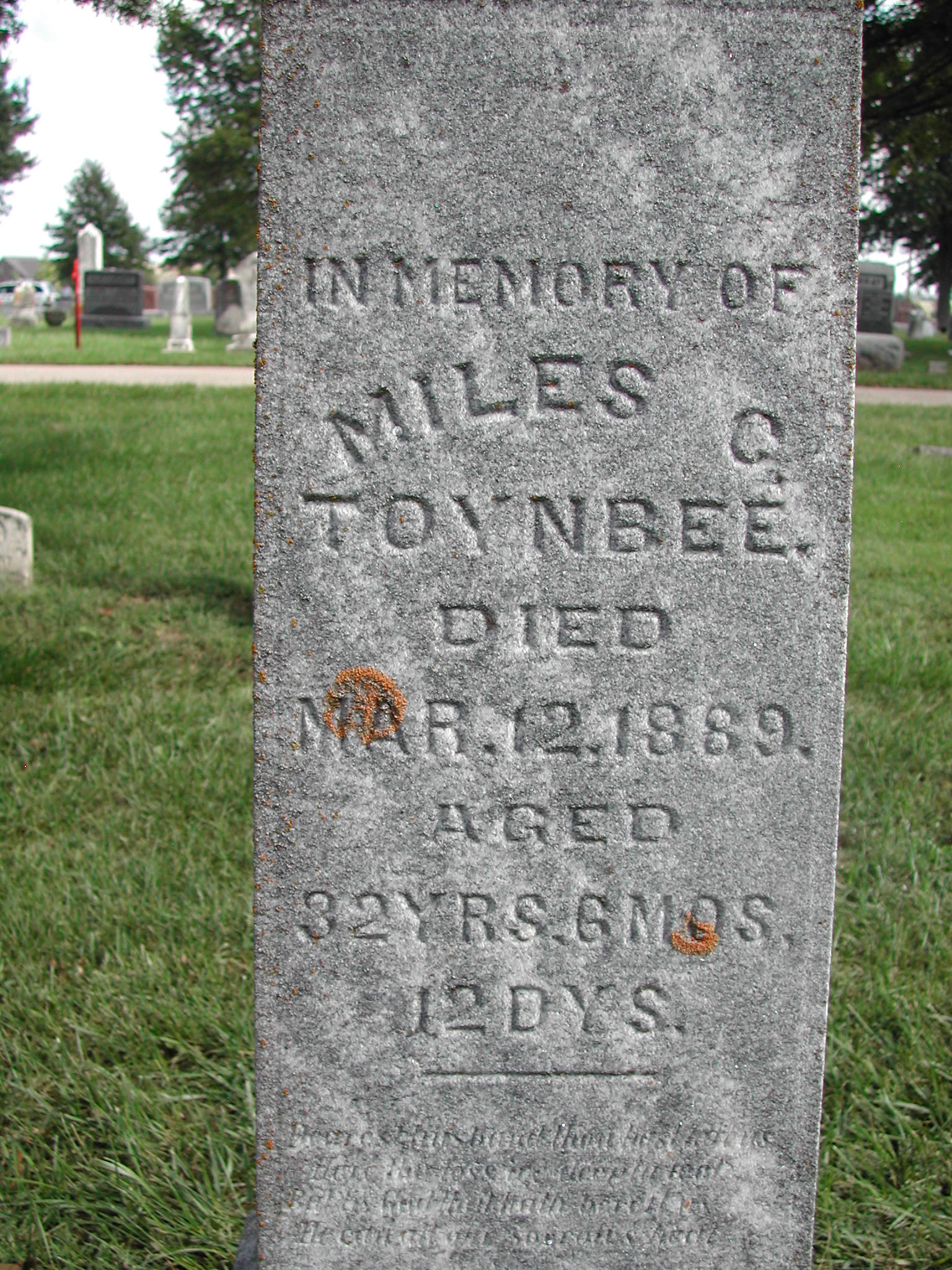 Toynbee, Miles C; d. 12 Mar 1889; a. 32 Yrs, 6 Mos, 12 Dys; - Veteran status N/A; Section 1; Row 05; Photo