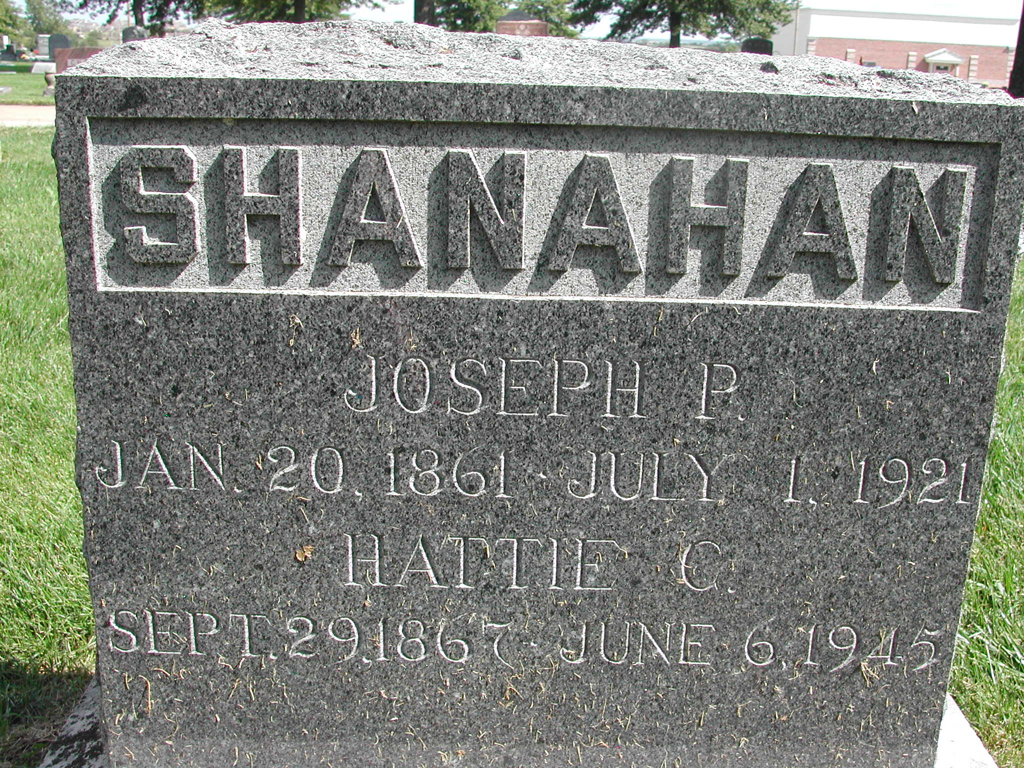 Shanahan, Joseph P; b. 20 Jan 1861; d. 01 Jul 1921; s/w Hattie C Shanahan; - Veteran status N/A; Section 1; Row 05; Photo