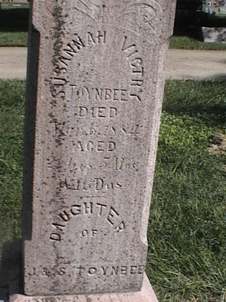 Toynbee, Susannah Victry; d. 06 Mar 1884; a. 21 Yrs, 5 Mos, 16 Dys; Daughter of J and S Toynbee; - Veteran status N/A; Section 1; Row 07; Photo