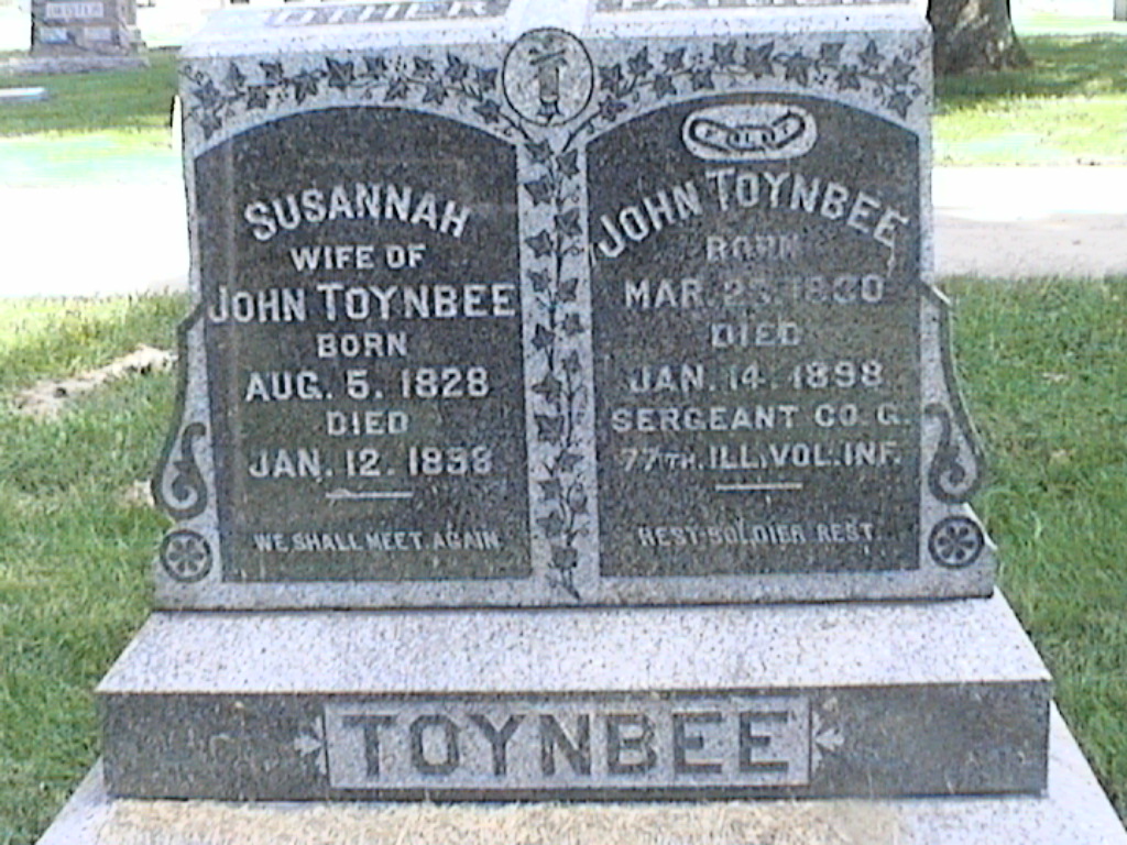 + Toynbee, John; b. 25 Mar 1830; d. 14 Jan 1898; Sergeant Co G 77th Ill Vol Inf, Mason; + Veteran; Section 1; Row 07; Photo