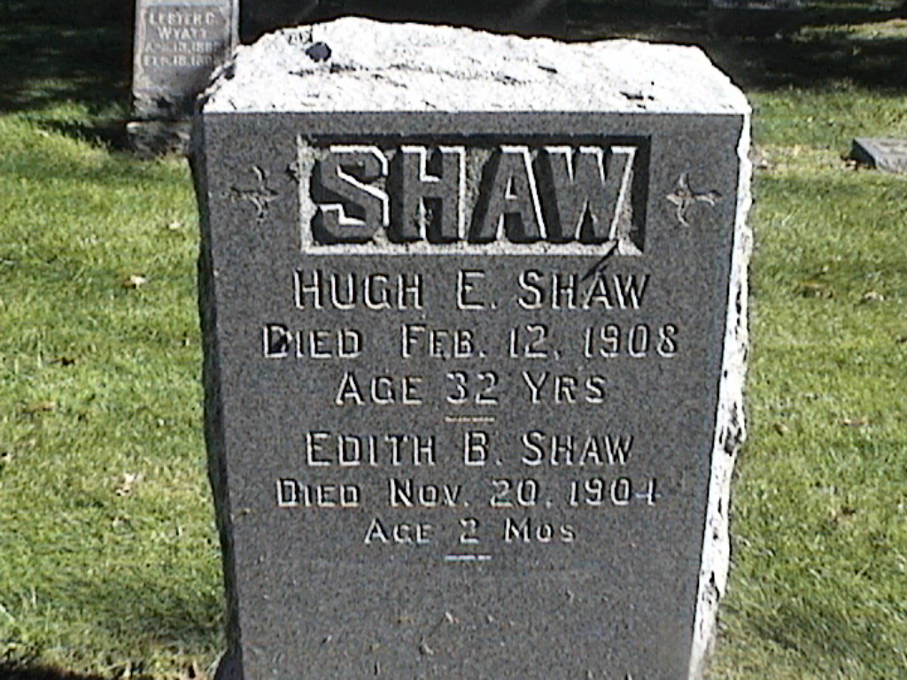Shaw, Hugh E; d. 12 Feb 1908; a. 32 Yrs; s/w Edith B Shaw; - Veteran status N/A; Section 2; Row 04; Photo