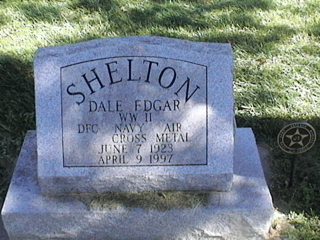 + Shelton, Dale Edgar; b. 07 Jun 1923; d. 09 Apr 1997; WW II DFC Navy Cross Air Metal; + Veteran; Section 2; Row 05; Photo