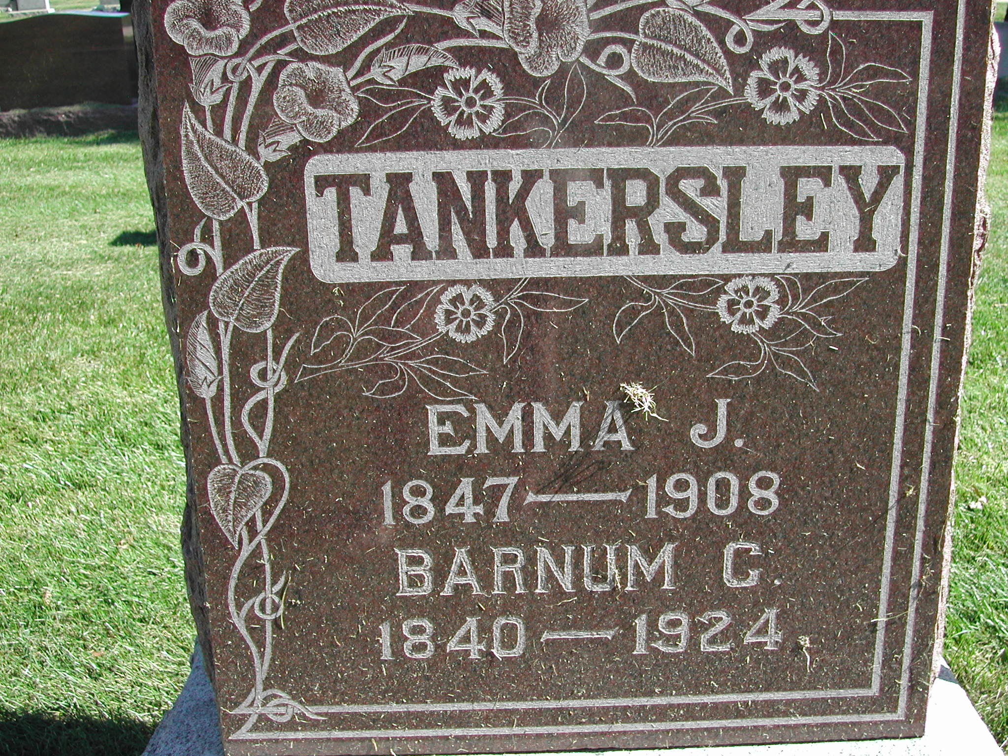 Tankersley, Emma J; b. 1847; d. 1908; Mother; s/w Barnum C Tankersley; - Veteran status N/A; Section 3; Row 04; Photo Photo