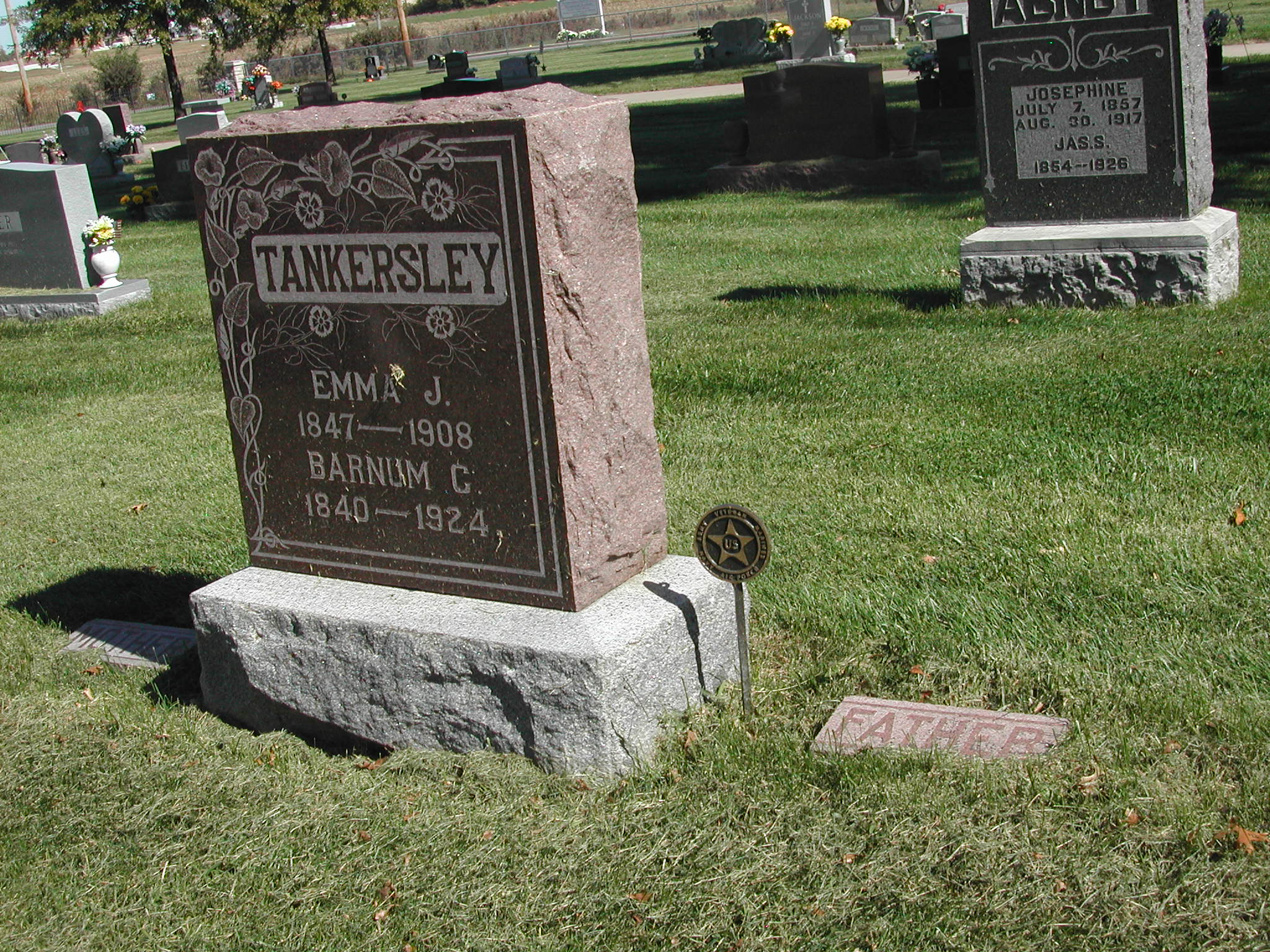 + Tankersley, Barnum C; b. 1840; d. 1924; Father; s/w Emma J Tankersley; + Veteran; Section 3; Row 04; Photo Photo Photo