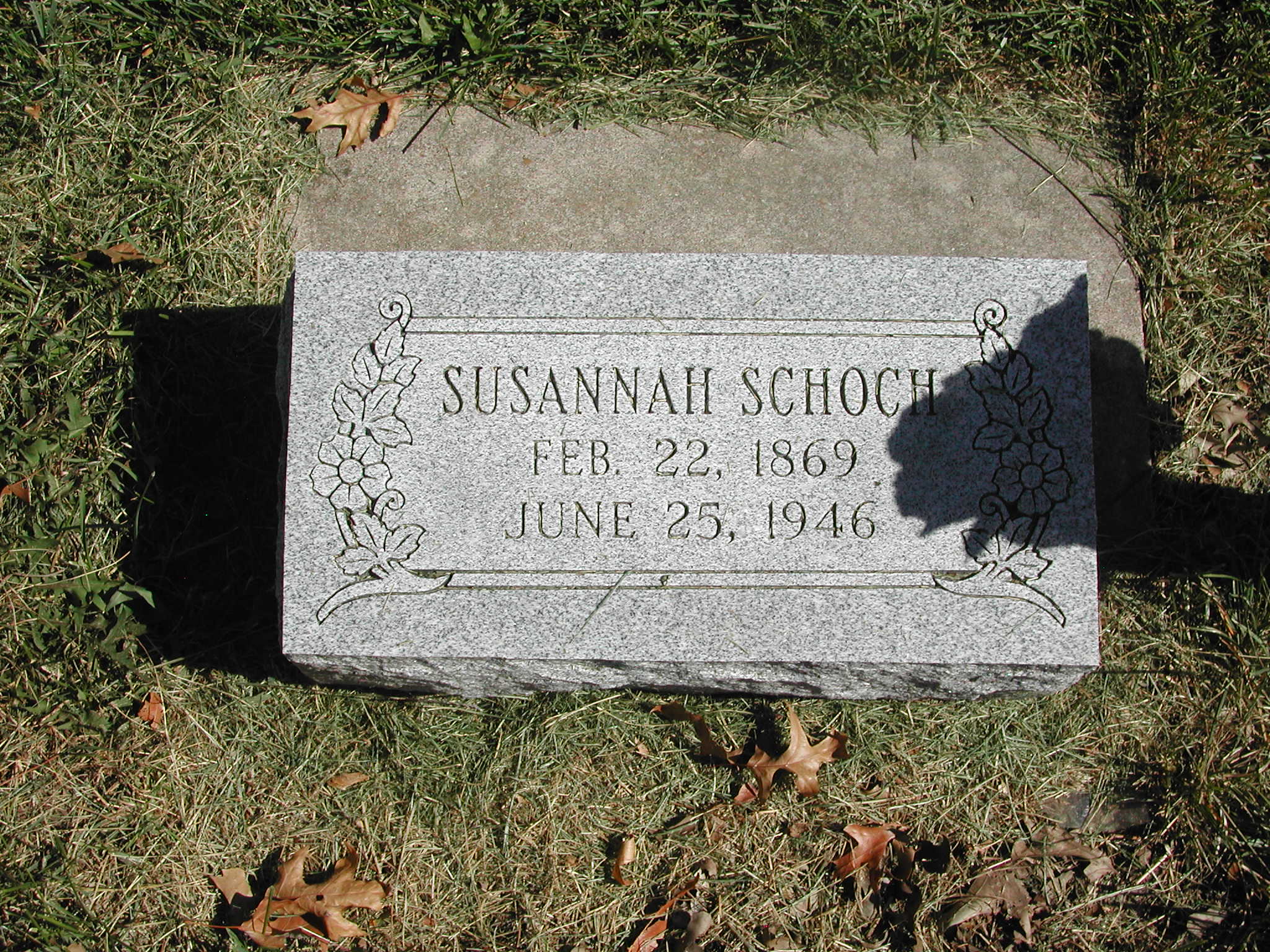 Schoch, Susannah; b. 22 Feb 1869; d. 25 Jun 1946; Footstone; - Veteran status N/A; Section 3; Row 04; Photo