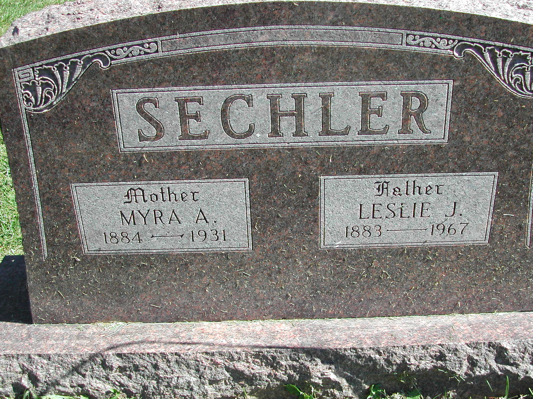 Sechler, Leslie J; b. 1883; d. 1967; Father; s/w Myra A Sechler; - Veteran status N/A; Section 3; Row 04; Photo