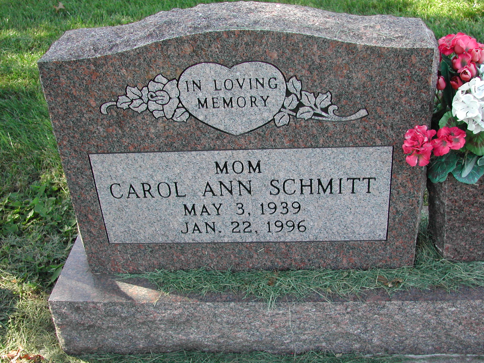 Schmitt, Carol Ann; b. 03 May 1939; d. 22 Jan 1996; Mom; - Veteran status N/A; Section 3; Row 07; Photo