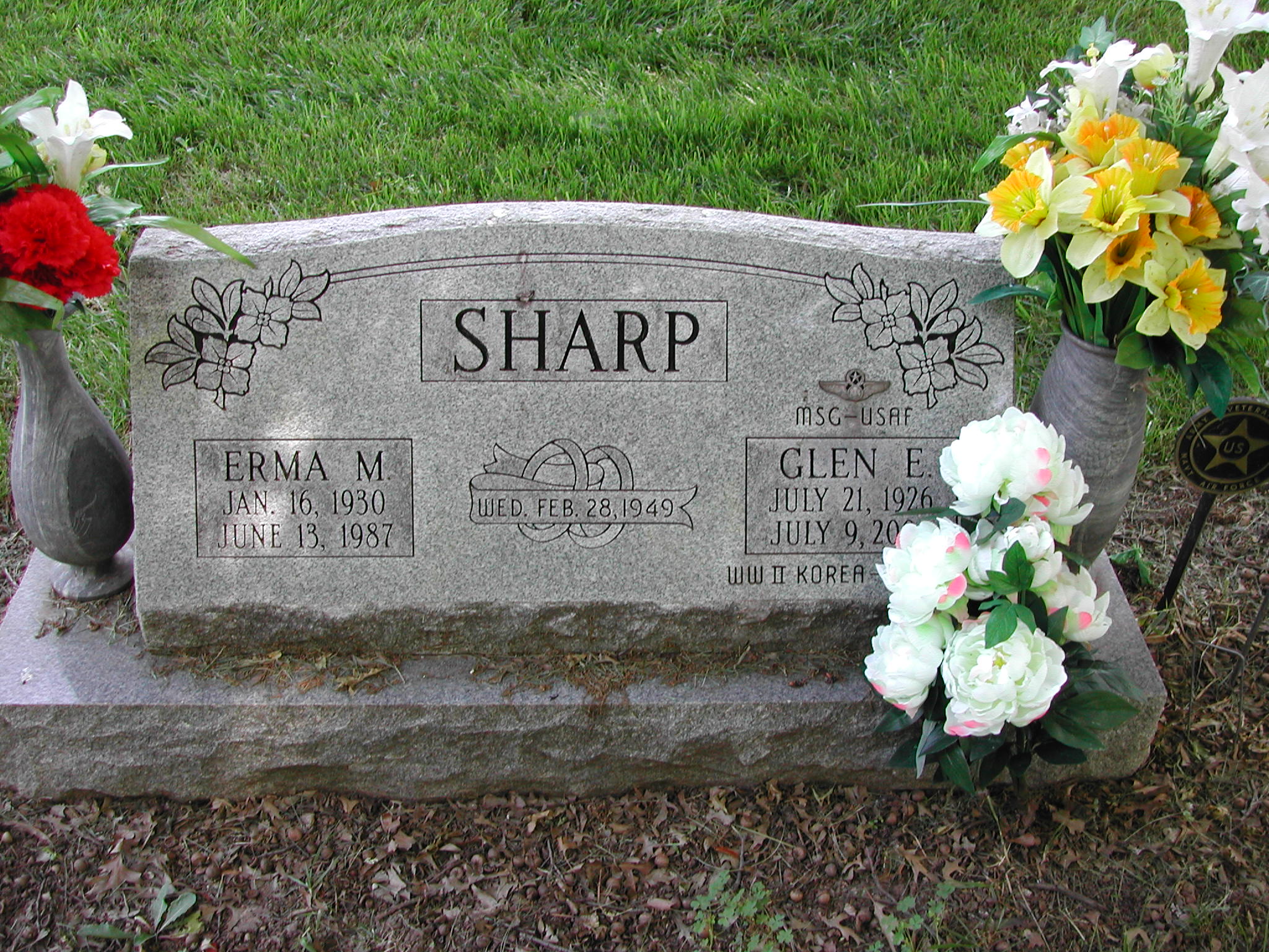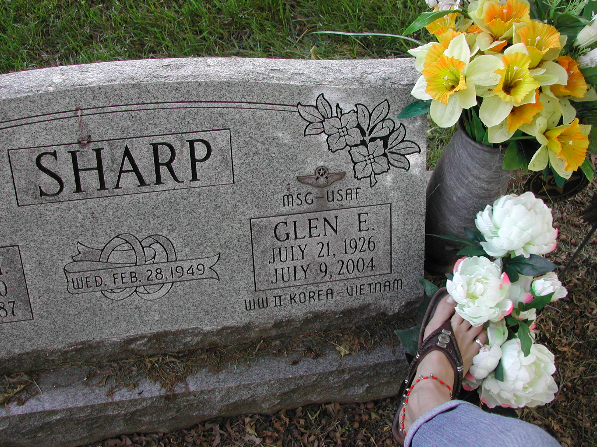 + Sharp, Glen E; b. 21 Jul 1926; d. 09 Jul 2004; m. 28 Feb 1949; Footstone Sharp; WW II Korea Vietnam, MSG-USAF; s/w Erma M Sharp; + Veteran; Section 4; Row 01; Photo Photo