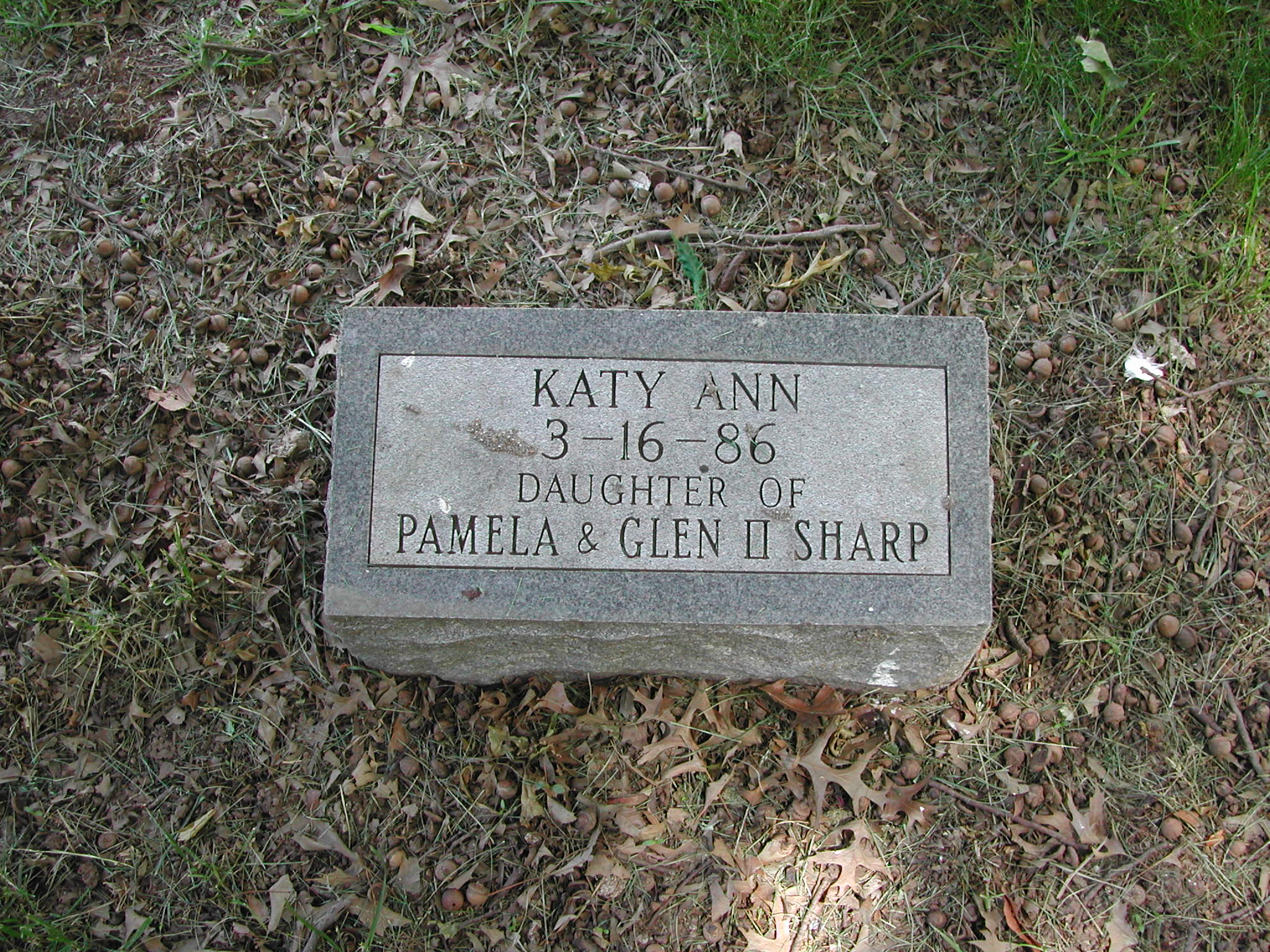 Sharp, Katy Ann; d. 16 Jun 1986; Daughter of Pamela and Glen E Sharp; - Veteran status N/A; Section 4; Row 01; Photo