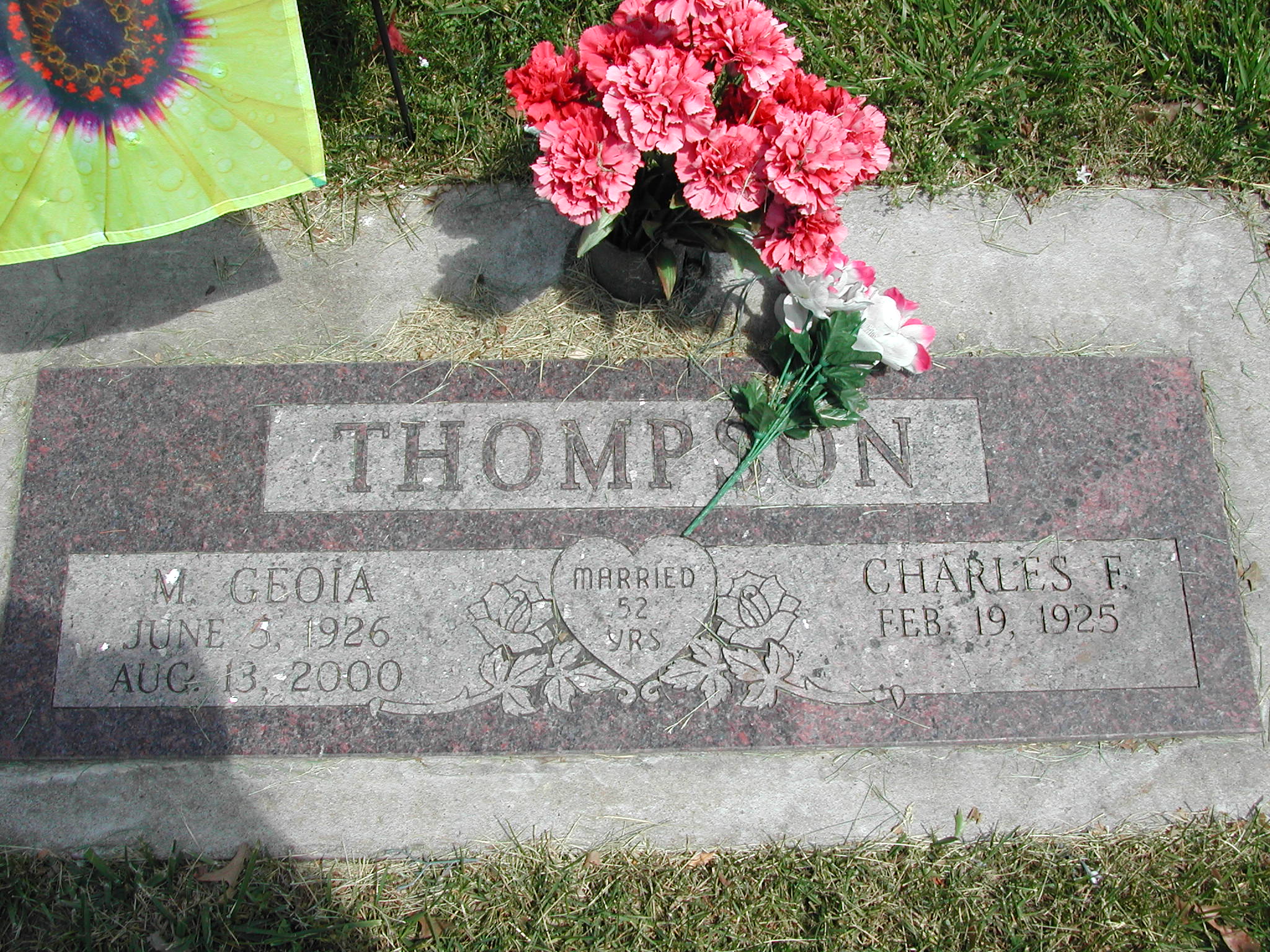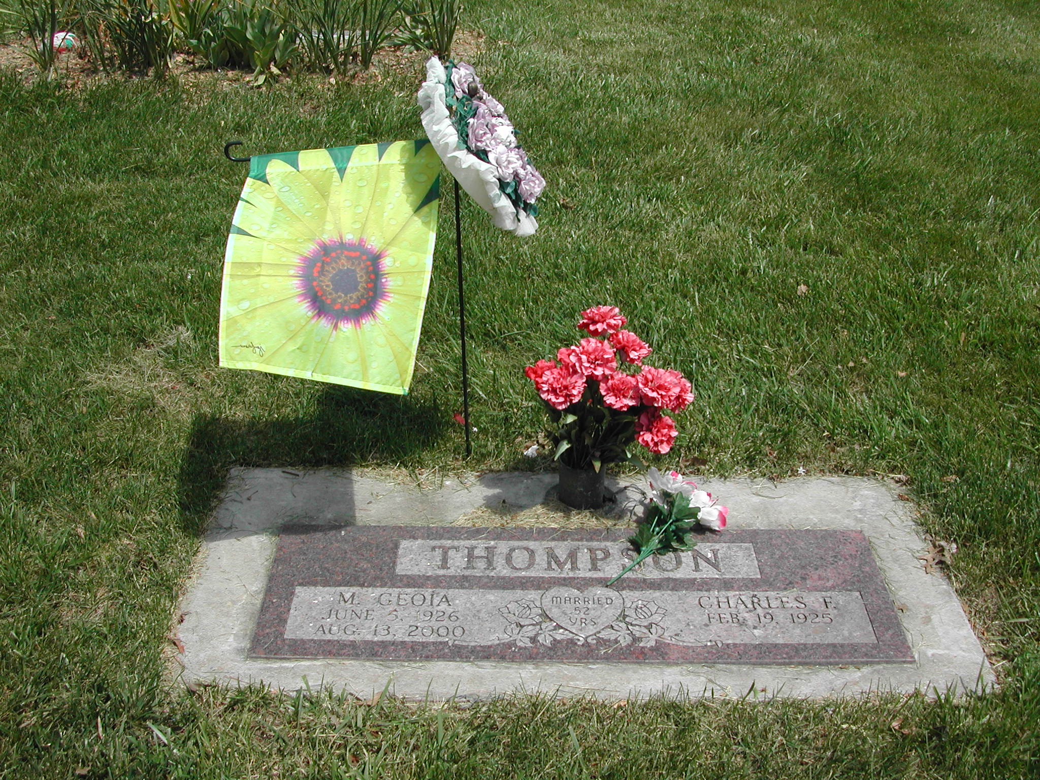 Thompson, M Geoia; b. 05 Jun 1926; d. 13 Aug 2000; Married 52 Yrs; s/w Charles F Thompson; - Veteran status N/A; Section 4; Row 01; Photo Photo