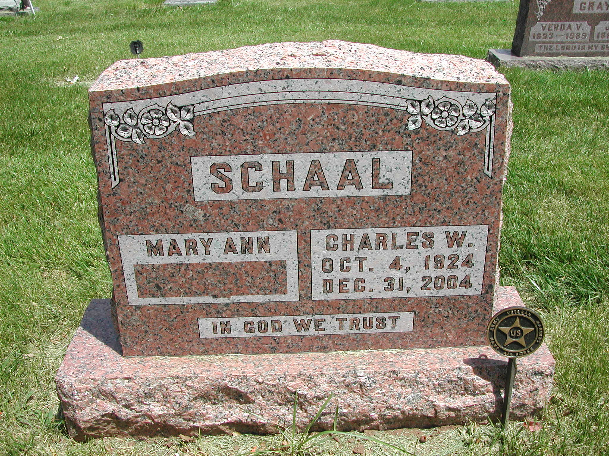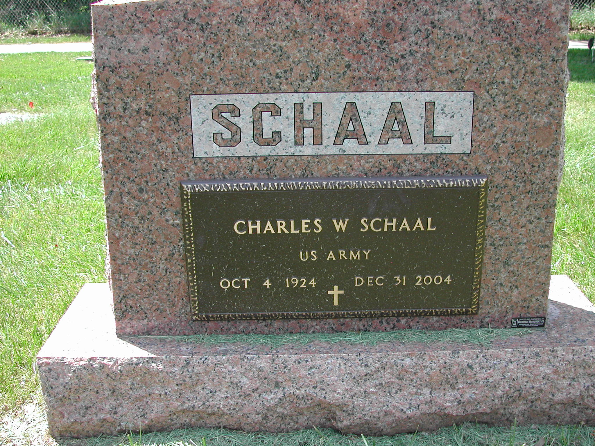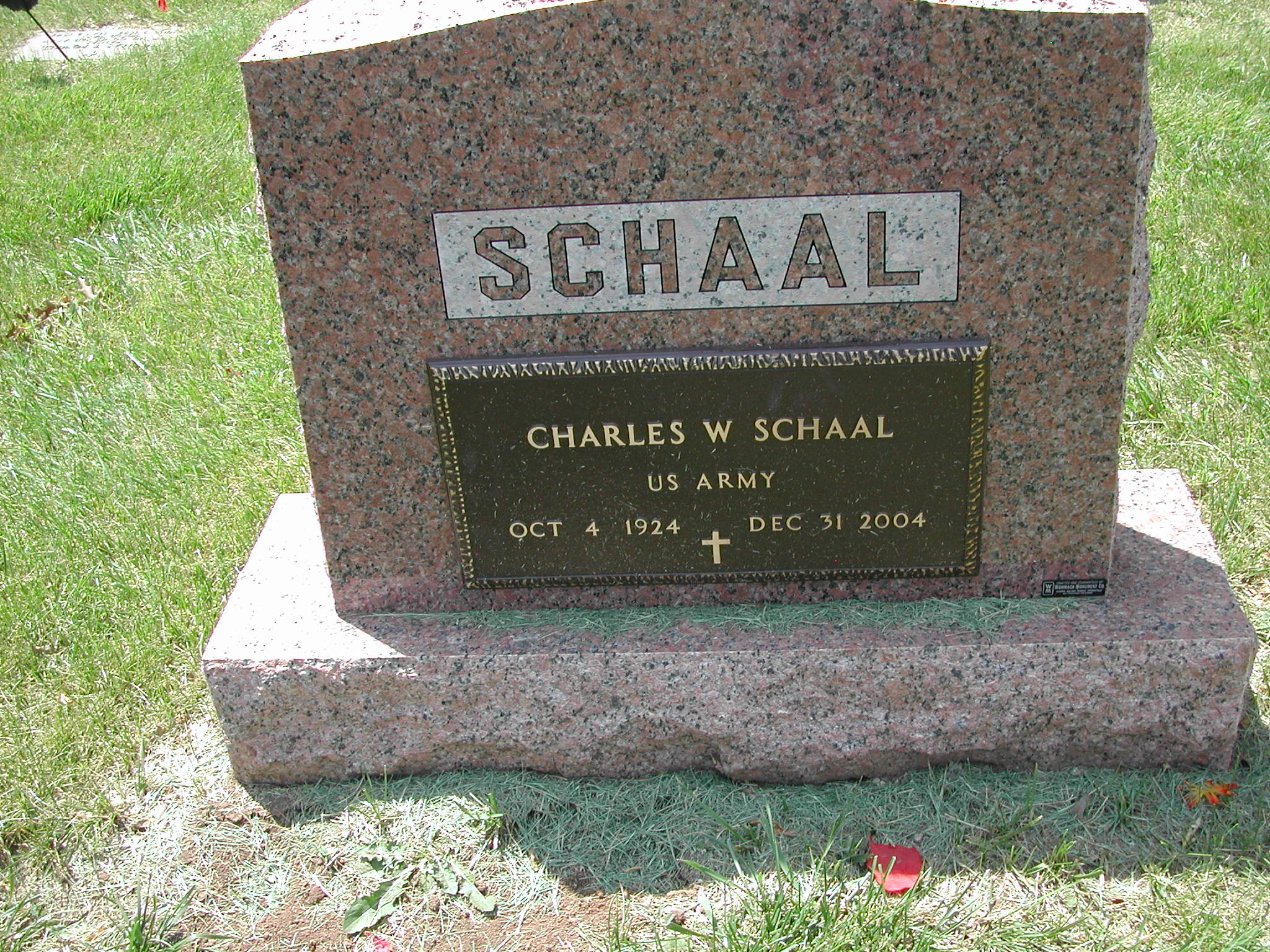 + Schaal, Charles W; b. 04 Oct 1924; d. 31 Dec 2004; Footstone Schaal; US ARMY; s/w Mary Ann Schaal, VET; + Veteran; Section 4; Row 03; Photo Photo Photo