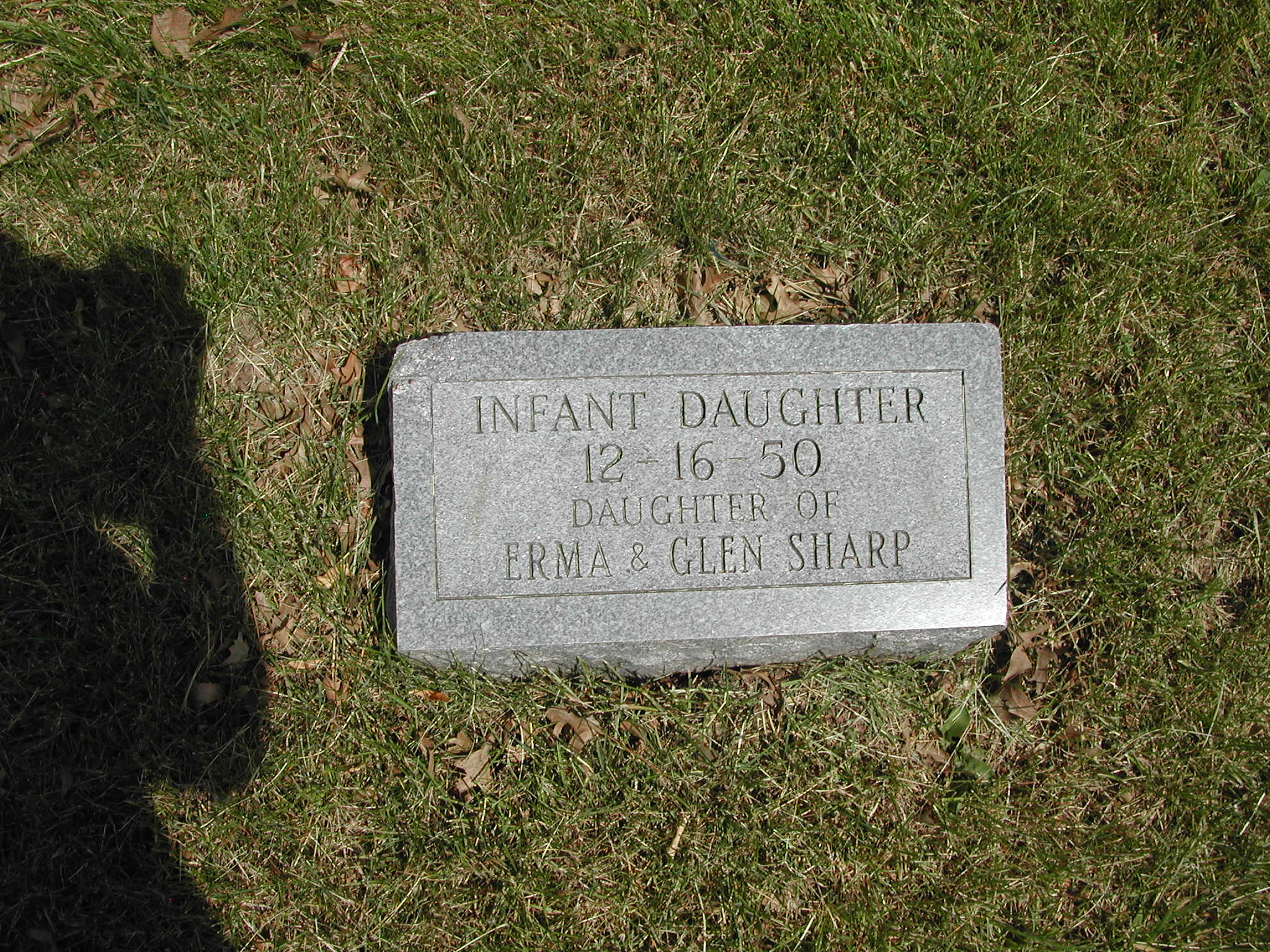 Sharp, Infant Daughter; d. 16 Dec 1950; Footstone Sharp; Daughter of Erma and Glen Sharp; - Veteran status N/A; Section 4; Row 05; Photo