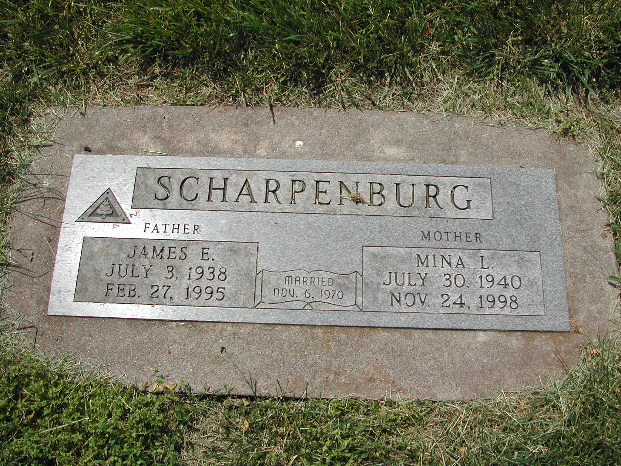 Scharpenburg, James E; b. 03 Jul 1938; d. 27 Feb 1995; m. 06 Nov 1970; Father Scharpenburg; s/w Mina L Scharpenburg; - Veteran status N/A; Section 4; Row 05; Photo