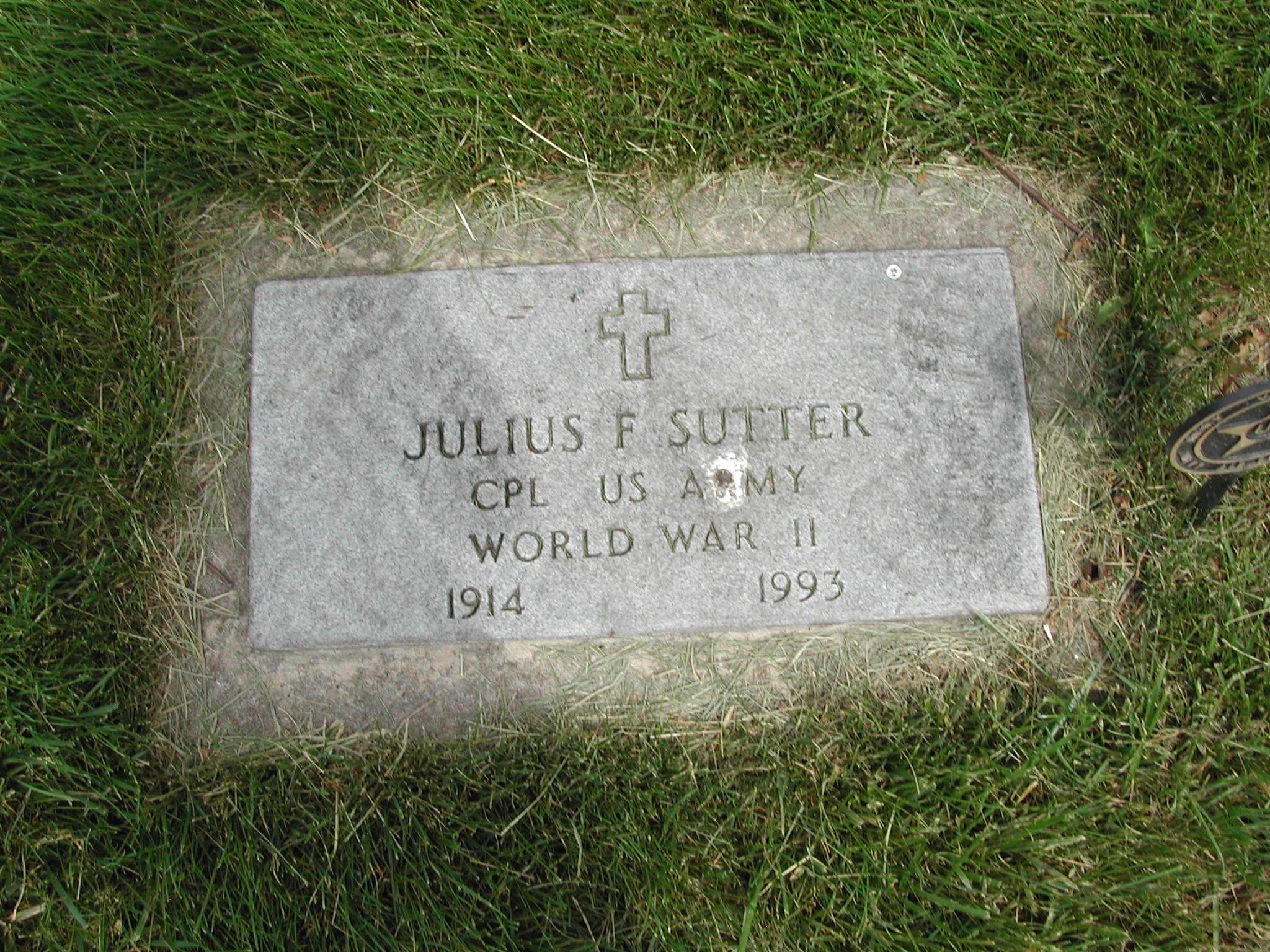 + Sutter, Julius F; b. 1914; d. 1993; CPL US Army World War II; + Veteran; Section 5; Row 01; Photo