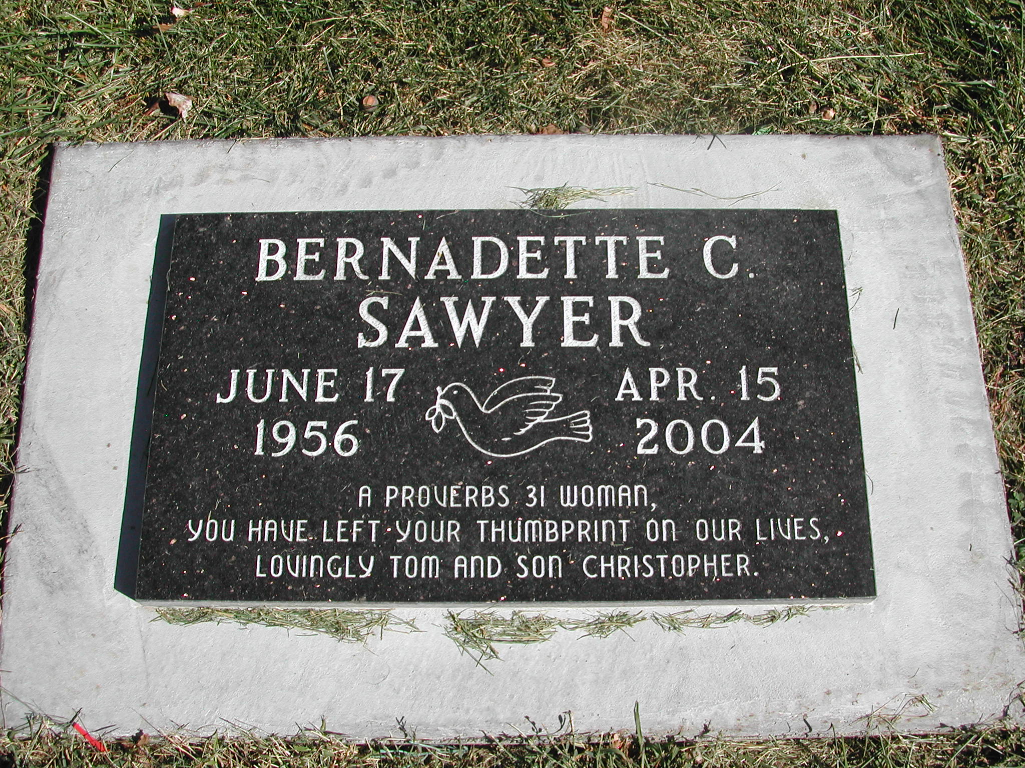 Sawyer, Bernadette C; b. 17 Jun 1956; d. 15 Apr 2004; - Veteran status N/A; Section 7; Row 06; Photo