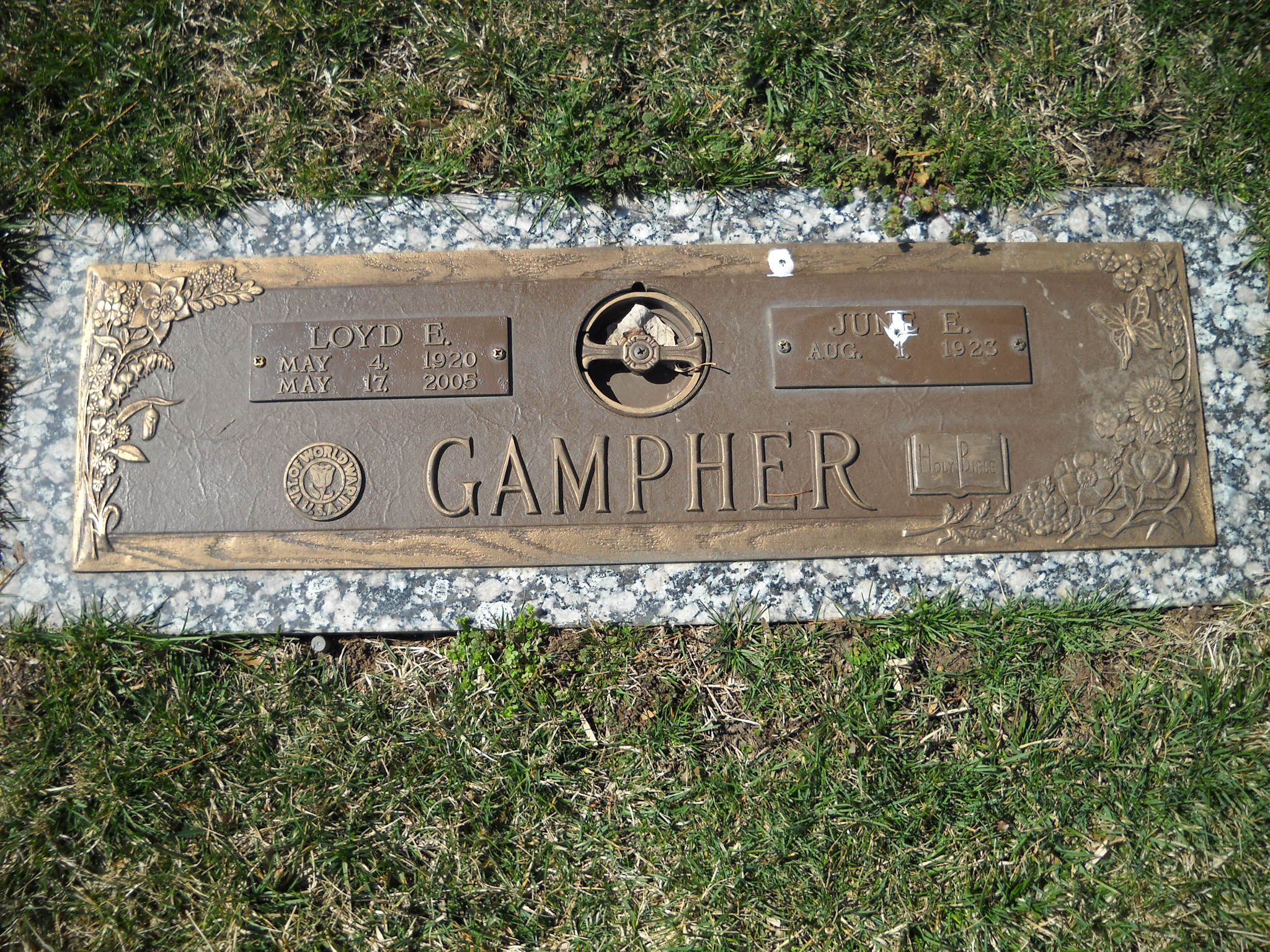 + Gampher, Loyd E; b. 04 May 1920; d. 17 May 2005; Vet of WWII USA; s/w June E Gampher; + Veteran; Section Ascension; Row 05; Photo