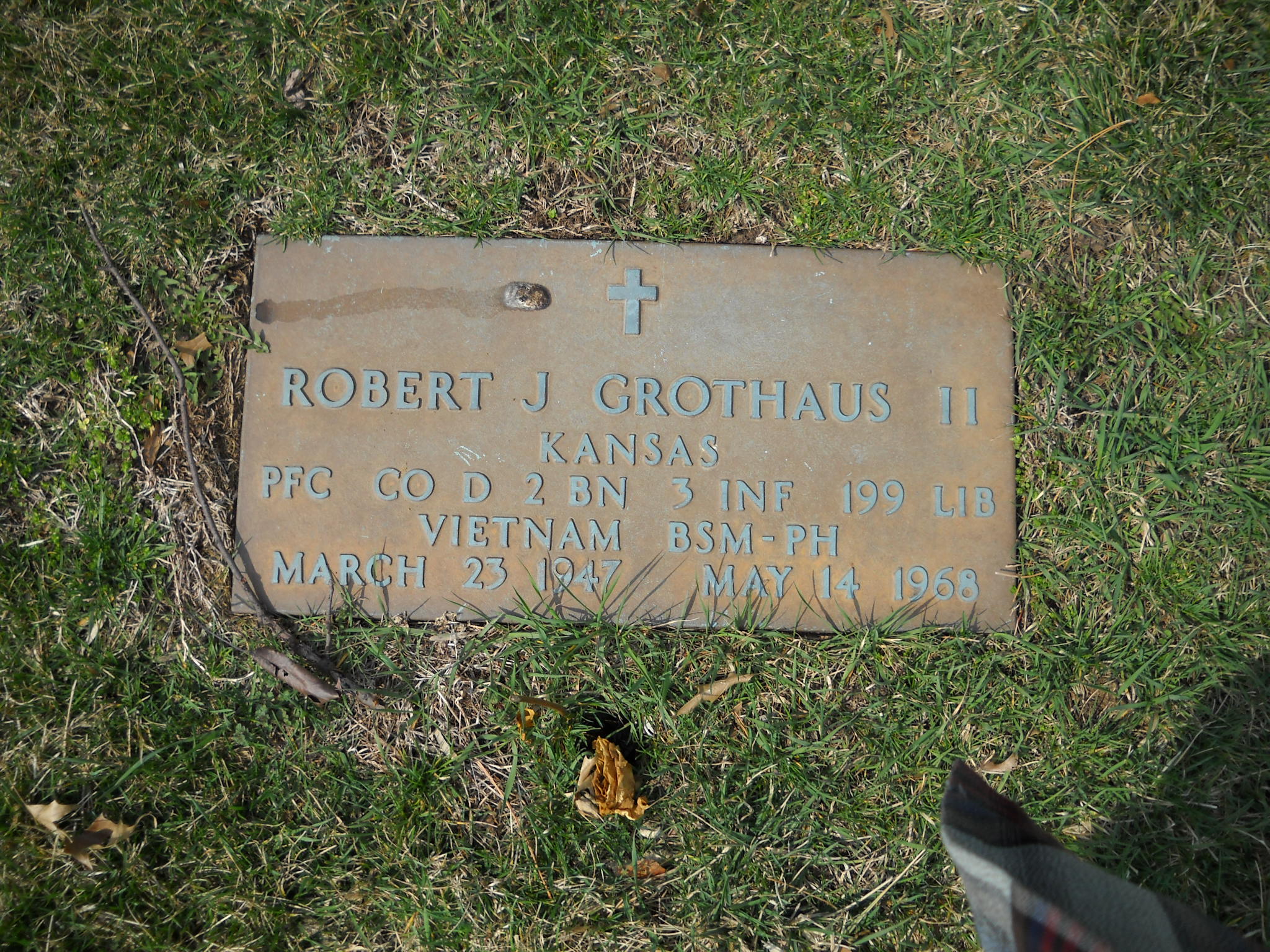 + Grothaus, Robert J II; b. 23 Mar 1947; d. 14 May 1968; Kansas PFC CO D 2 BN 3 INF 199 LIB Vietnam BSM-PH; + Veteran; Section Ascension; Row 23; Photo