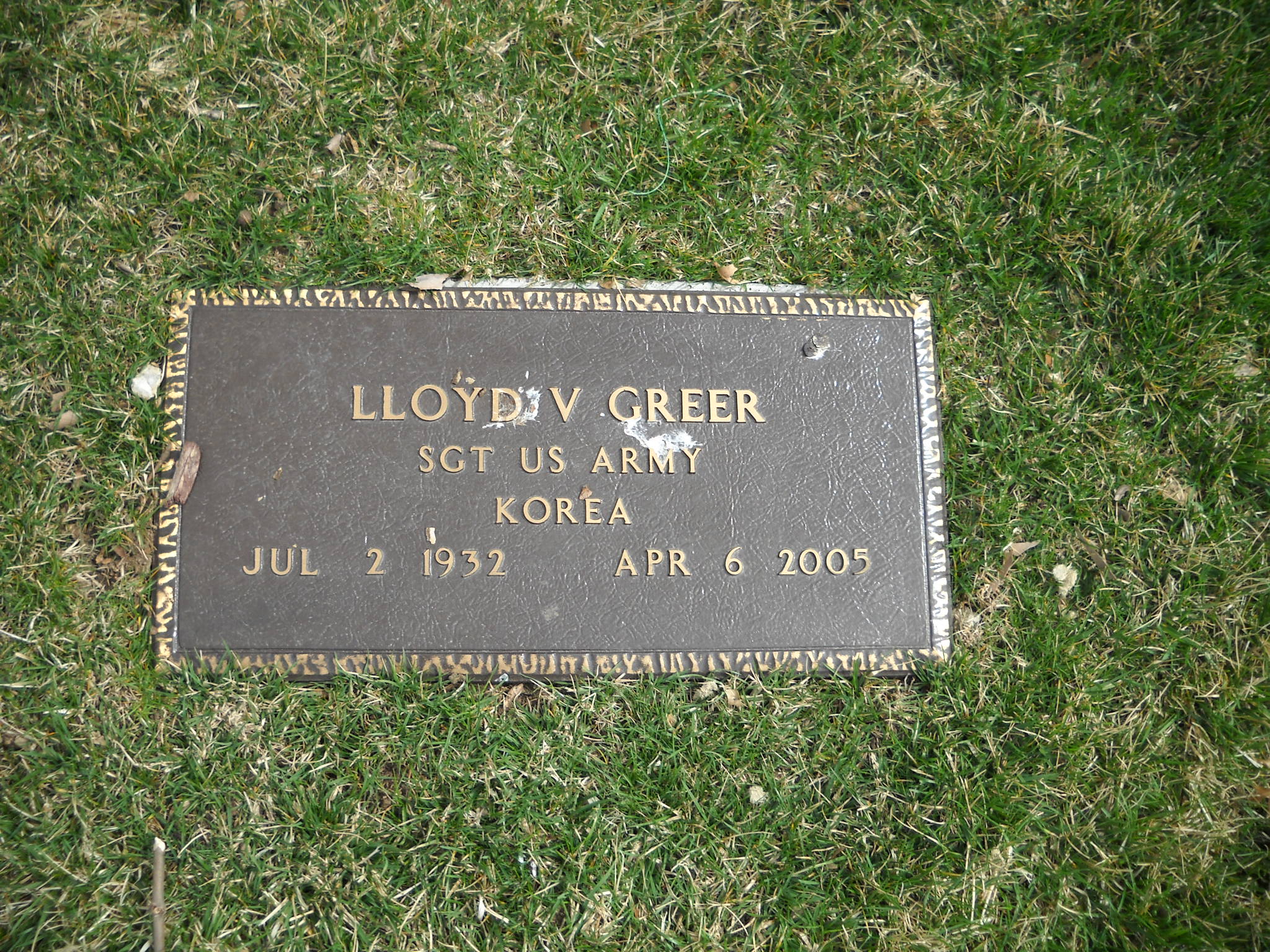 + Greer, Lloyd V; b. 02 Jul 1932; d. 06 Apr 2005; Dad, SGT US Army Korea; + Veteran; Section Ascension; Row 33; Photo Photo