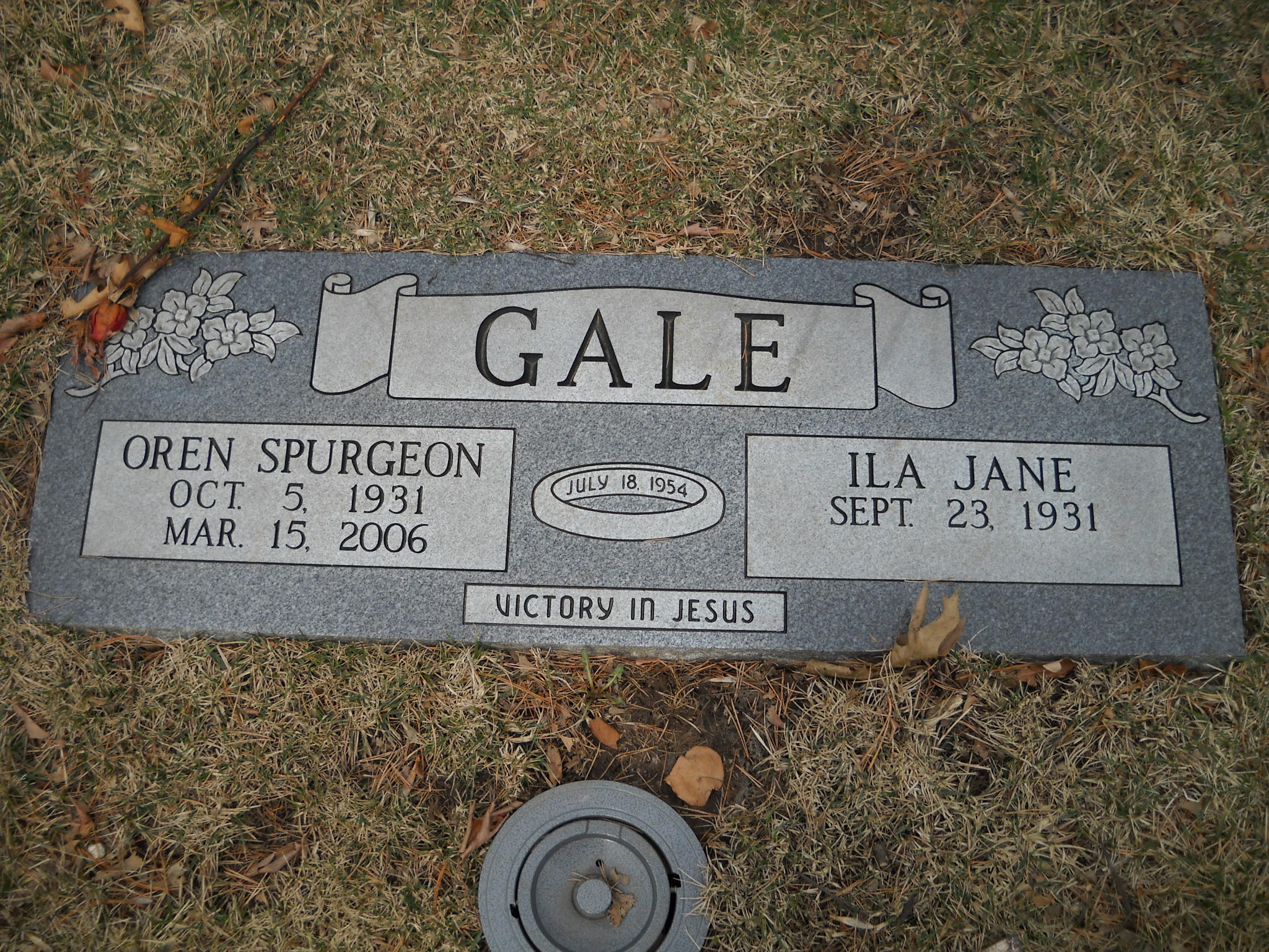 Gale, Oren Spurgeon; b. 05 Oct 1931; d. 15 Mar 2006; m. 18 Jul 1954; s/w Ila Jane Gale; - Veteran status N/A; Section Charity Gdn; Row 11; Photo