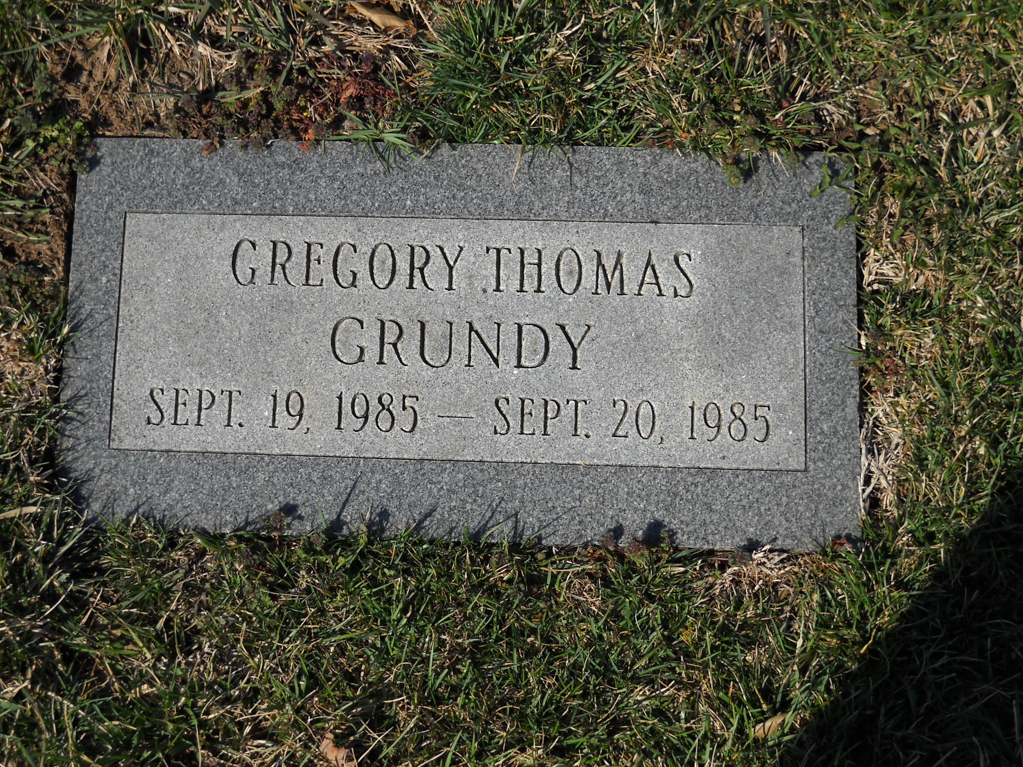 Grundy, Gregory Thomas; b. 19 Sep 1985; d. 20 Sep 1985; - Veteran status N/A; Section Infant; Row 02; Photo