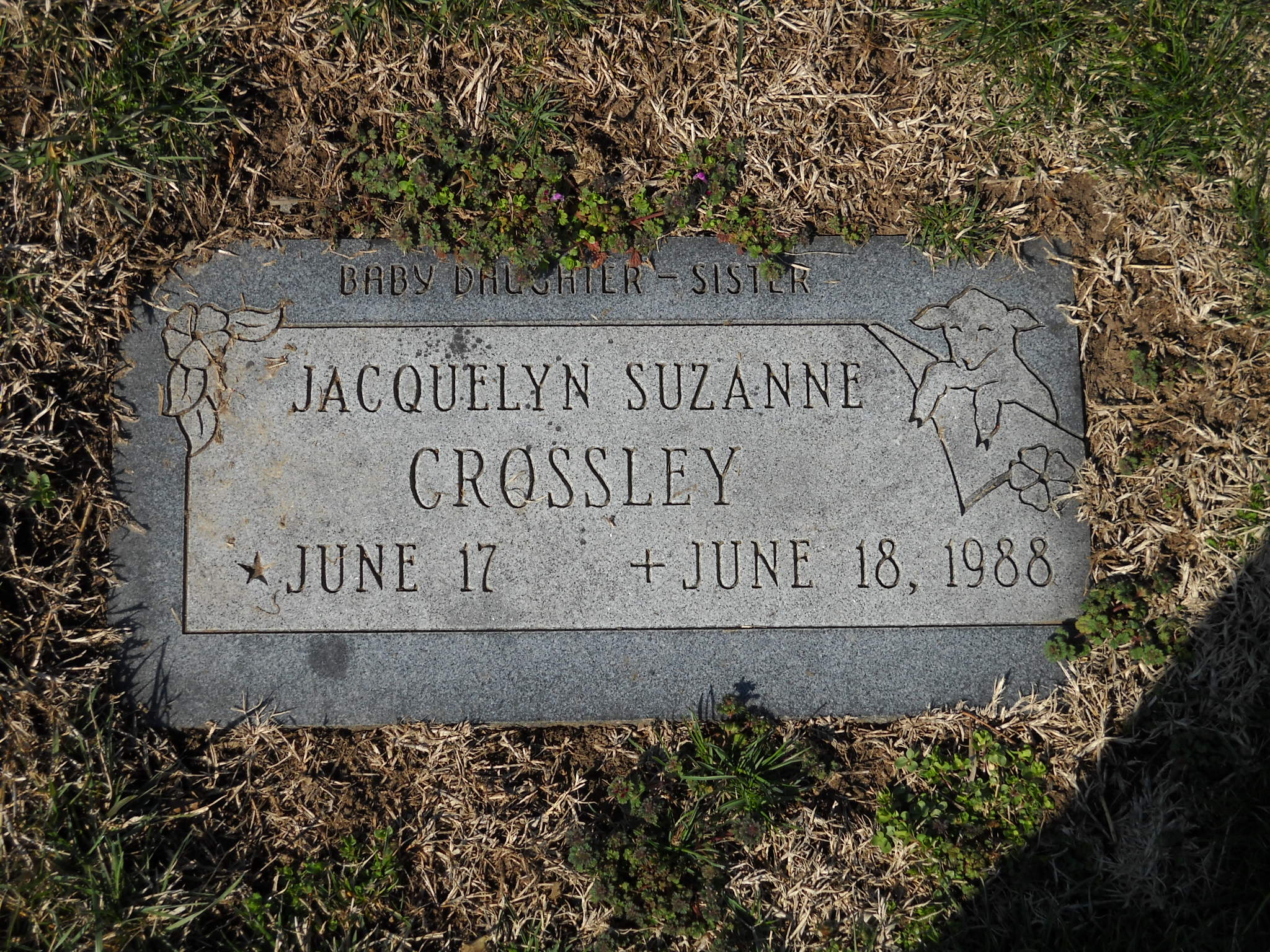 Grossley, Jacquelyn Suzanne; b. 17 Jun 1988; d. 18 Jun 1988; - Veteran status N/A; Section Infant; Row 03; Photo