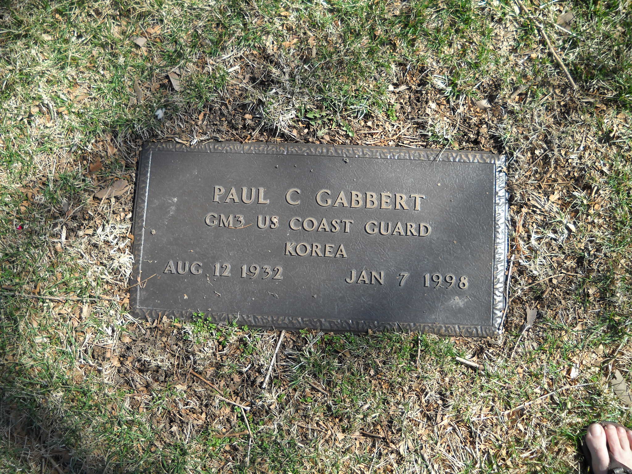 + Gabbert, Paul C; b. 12 Aug 1932; d. 07 Jan 1998; GM3 US Coast Guard Korea; s/w Helen L Gabbert; + Veteran; Section Queen Gdn B3; Row 05; Photo Photo