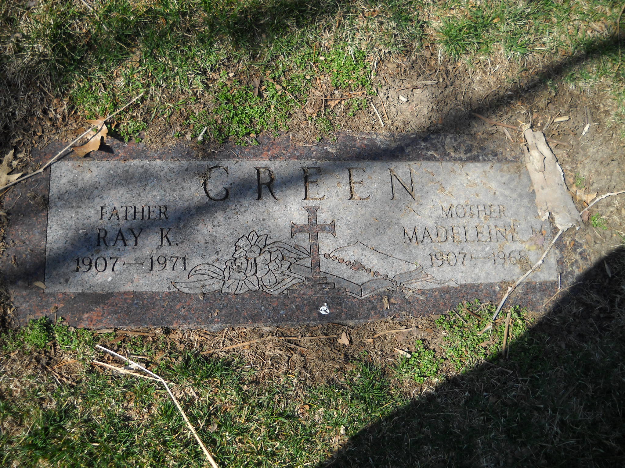 Green, Ray K; b. 1907; d. 1971; Father; s/w Madeleine M Green; - Veteran status N/A; Section Queen Gdn B3; Row 08; Photo
