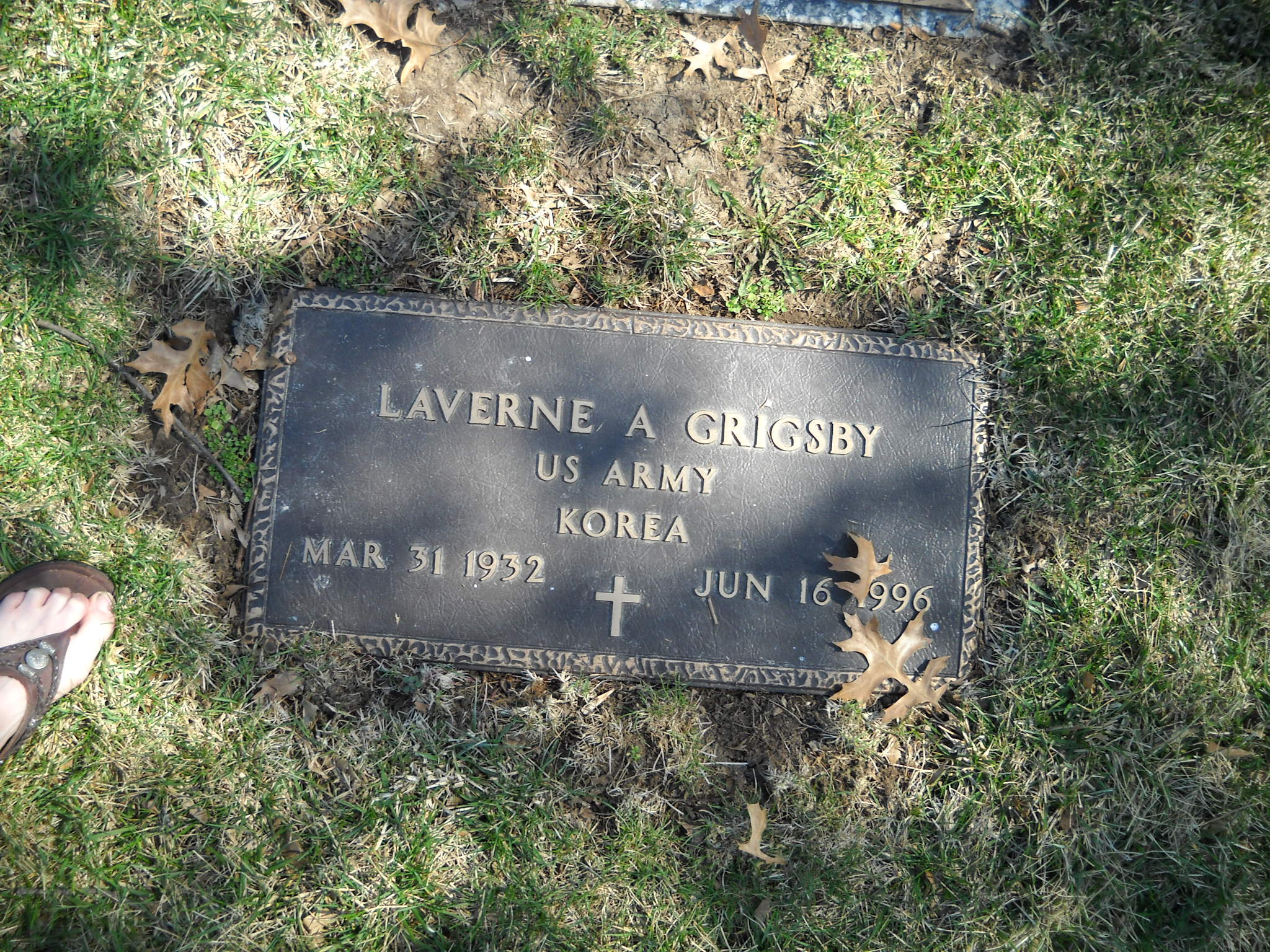 + Grigsby, Laverne A; b. 31 Mar 1932; d. 16 Jun 1996; US Army Korea; s/w Shirley A Grigsby and Rita F Grigsby; + Veteran; Section Queen Gdn B4; Row 07; Photo Photo